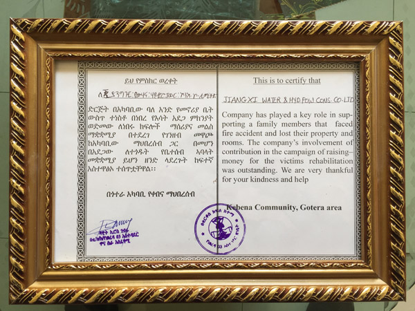 近期,在我辦事處所在地社區居民Alemayehu Bekele家不幸遭遇無情火災、家庭陷入極度困境的時刻,江西水建駐埃分公司向其伸出援手,助其迅速重建家園。事后,Gotera社區協調員及警察所官員一行為我公司這種義舉表示贊賞并頒發了感謝證證書。