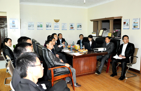 集團(tuán)資訊 當(dāng)?shù)貢r間2015年7月16日,中國駐肯尼亞經(jīng)濟(jì)商務(wù)處參贊郭策一行到我司肯尼亞分公司調(diào)研。肯尼亞分公司總經(jīng)理賀翔、副總經(jīng)理彭紅軍及相關(guān)人員迎接并陪同調(diào)研。