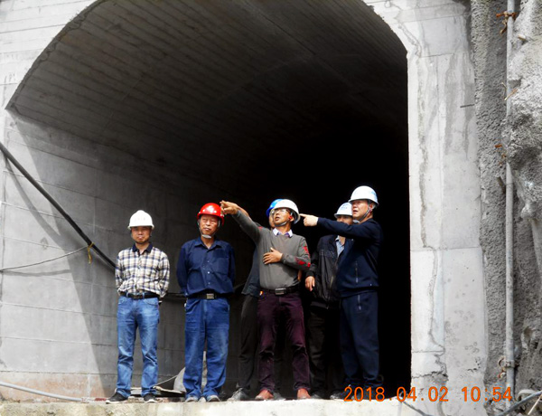 董事長在導(dǎo)流洞出口聽取項(xiàng)目經(jīng)理匯報工程進(jìn)展情況
