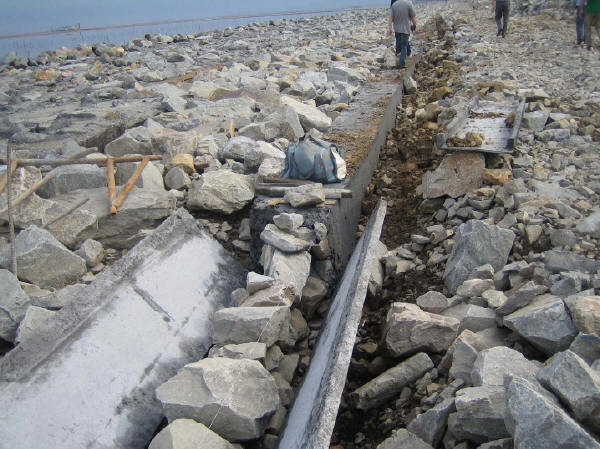 擋墻砌筑應(yīng)分層,每一砌筑層擺石時(shí)均應(yīng)座漿,隨鋪漿隨砌筑。嚴(yán)禁石塊大面無漿直接貼靠。混凝土必須用振搗器逐縫振搗。當(dāng)豎縫寬度在5cm以上時(shí),可填漿后塞片石。嚴(yán)禁先堆砌石塊再用膠結(jié)料灌縫。