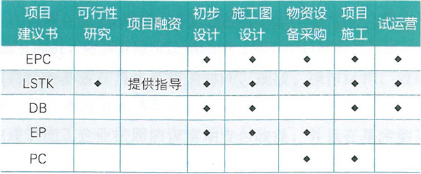 常見的工程總承包方式。工程總承包的主要方式有:設(shè)計(jì)采購施工總承包(EPC )、交鑰匙工程總承包 (LSTK )、設(shè)計(jì)建造工程總承包(DB )、設(shè)計(jì)采購總承包 (EP )、采購施工總承包(PC )。不同的承包方式,參與項(xiàng)目實(shí)施過程中的不同環(huán)節(jié)(見表1 )。