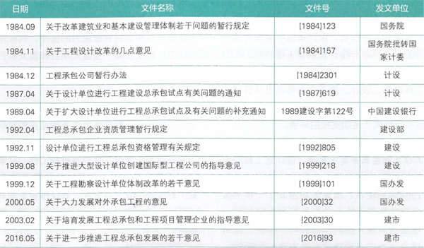 20世紀(jì)80年代,我國相關(guān)部門就下發(fā)文件,要求在設(shè)計(jì)、施工企業(yè)組建開展工程總承包的試點(diǎn),從國家頒布的一系列文件中可以看出我國在推廣工程總承包業(yè)務(wù)方面的幾點(diǎn)變化(見表2 )。